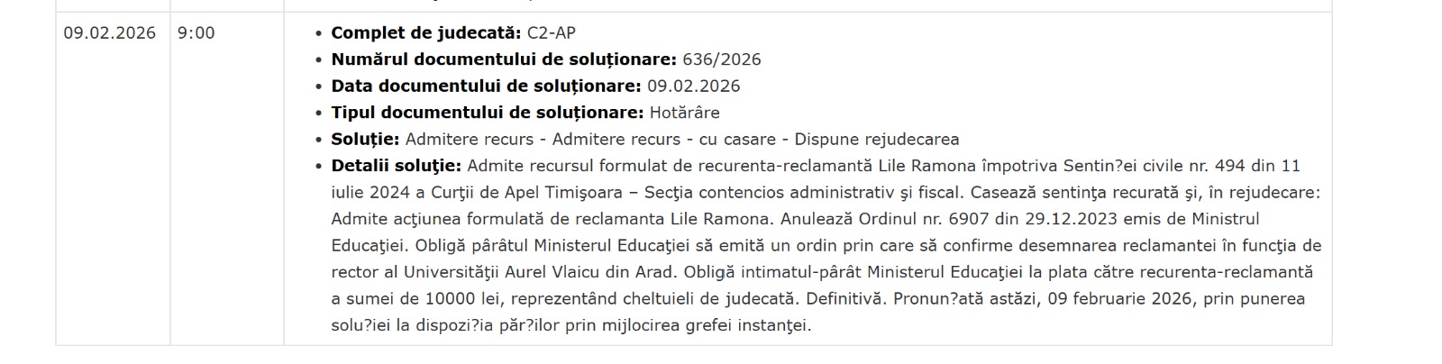 Minuta sentinței din 2026 în Dosarul 168/59/2024 al ICCJ consemnează obligarea ministrului Educației „să emită un ordin prin care să confirme desemnarea reclamantei în funcția de rector al Universității Aurel Vlaicu din Arad”.